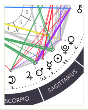 Five planet stellium, in the 5th house of personal creative expression: two potent conjunctions, one with three planets, the other with two. Jupiter (5°), Mars (7°), Mercury (13°): expansive, passionate communication; Sun (24°), Pluto (26°): penetrating illumination.
